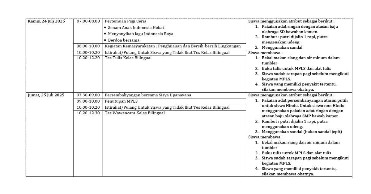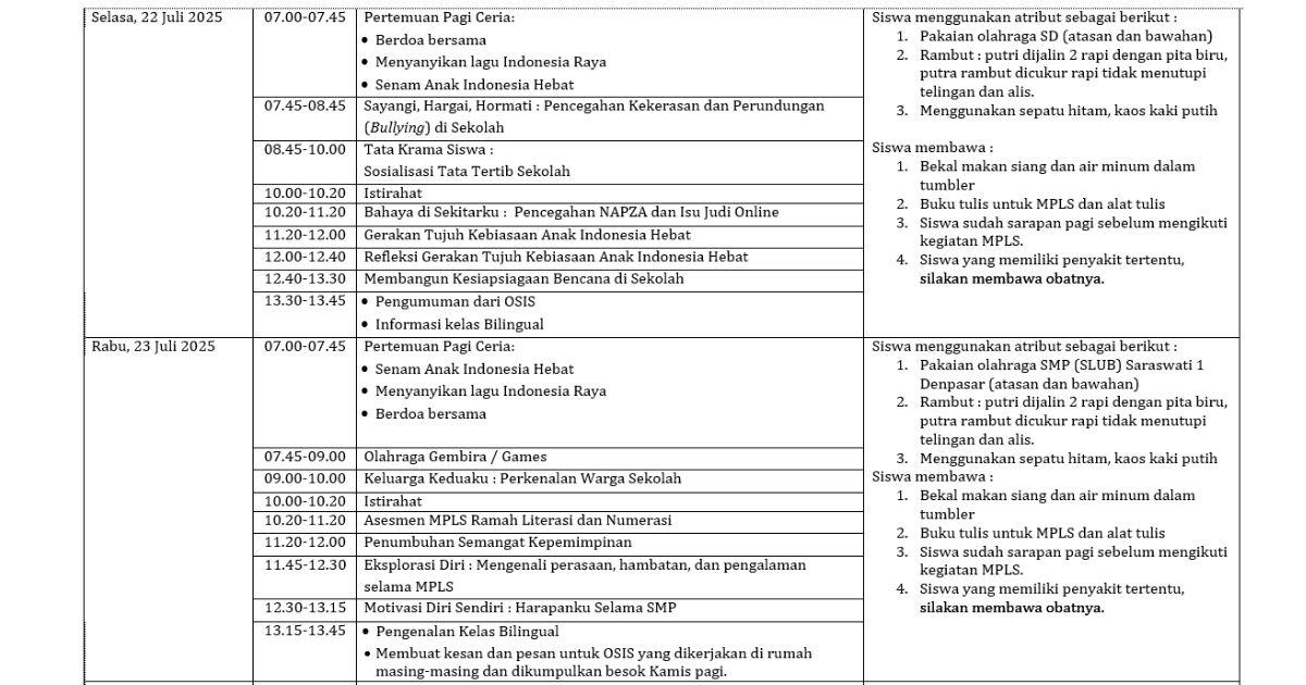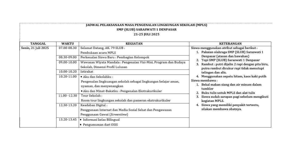 Seluruh siswa baru kelas 7 SMP (SLUB) Saraswati 1 Denpasar akan mengikuti kegiatan Masa Pengenalan Lingkungan Sekolah (MPLS) yang akan dilaksanakan pada 21-25 Juli 2025. Kegiatan ini diharapkan dapat menjadi fondasi awal untuk kalian mengenal keluarga baru kalian di SMP (SLUB) Saraswati 1 Denpasar. Jadwal kegiatan MPLS dapat diunduh pada [link Jadwal MPLS]